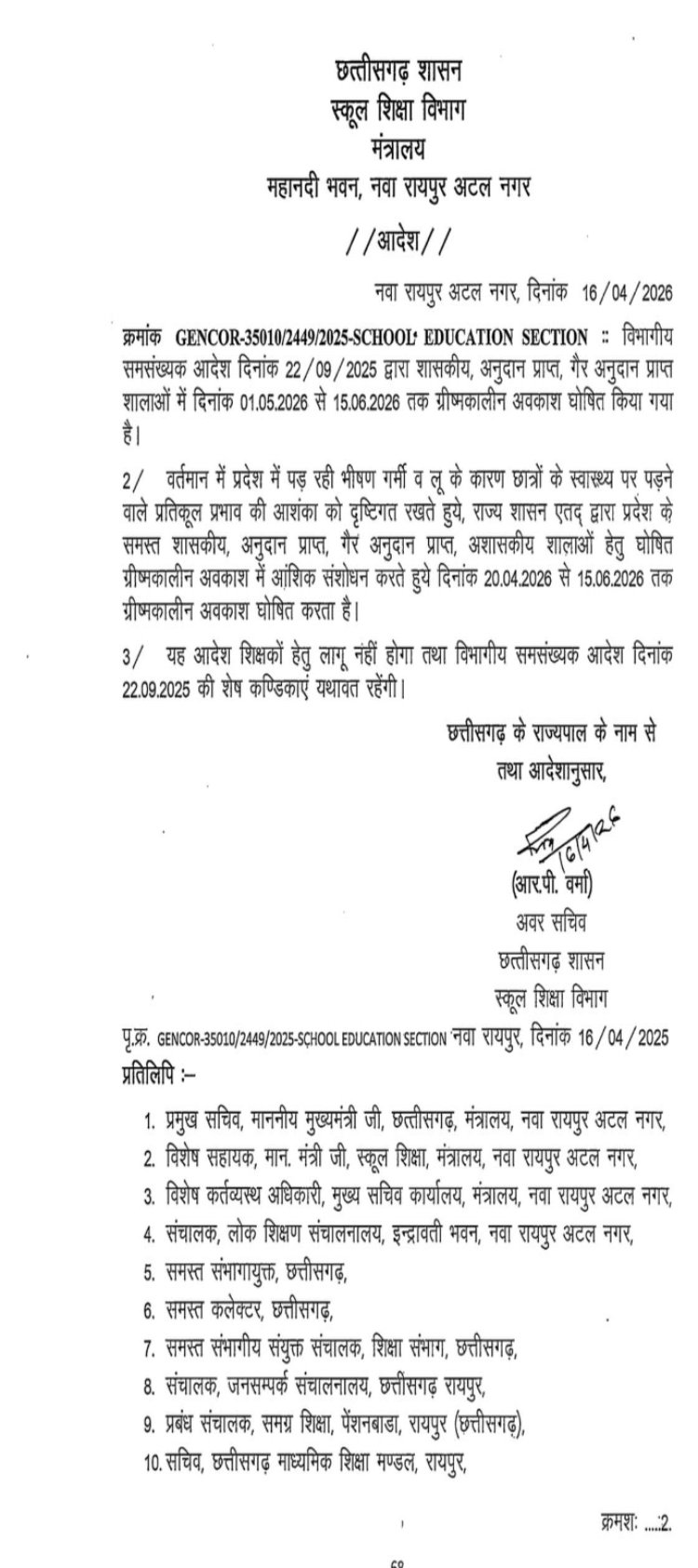 16 अप्रैल 2026 रायपुर :- छत्तीसगढ़ में शुरू हो गईं गर्मियों की छुट्टिया, अगले सप्ताह से बंद हो जाएंगे स्कूल छत्तीसगढ़ में भीषण गर्मी का असर बढ़ रहा है, जिसका असर बच्चों पर भी पड़ रहा है. इसी के चलते राज्य सरकार ने एक बड़ा फैसला लिया है. इसके तहत स्कूलों में समर हॉलीडे यानी गर्मियों की छुट्टियां (Summer Holiday) का ऐलान किया है. अगले सप्ताह के पहले सोमवार (20 अप्रैल) से ही अब स्कूल बंद हो जाएंगे. इसके बाद अगला शैक्षणिक सत्र 15 जून से शुरू होगा. यह आदेश प्रदेश के सभी तरह के सरकारी, अनुदान प्राप्त, गैर अनुदान प्राप्त एवं अशासकीय स्कूलों पर लागू होगा.